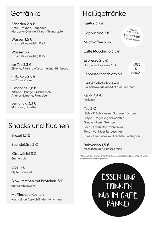 Kleine Pause gefällig? Gönne Dir eine kleine Stärkung in unserem Café. Hier bekommst Du eine erfrischende Saftschorle, einen cremigen Milchkaffee oder auch eine Kola als extra Wachmacher =). Auch für den kleinen Hunger ist gesorgt mit Brezeln, Würstchen, Kuchen oder einem leckeren Apfel für den extra Vitaminschub. Mitgebrachte Getränke und Snacks dürfen bei uns ebenfalls verzehrt werden.