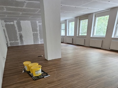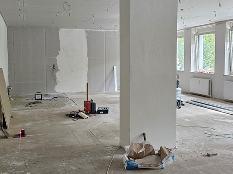 Anfang des Jahres 2020 wurde das Gebäude, in dem sich unsere kleine Ausstellung befand, verkauft. Im März kam der erste Corona-Lockdown und mit ihm die Kündigung unserer Räume, wegen Eigenbedarf. Die Immobilienlage in Mainz hatte zu diesem Zeitpunkt nicht wirklich große Auswahl zu bieten in der Größe, die wir benötigten und so mussten wir uns entscheiden. Verabschieden wir uns von "Ich mach Mathe!" oder gehen wir auf volles Risiko und mieten erneut Räume, die eigentlich zu groß für uns sind. Und natürlich wurde es zweites. An unserem jetzigen Standort fanden wir letztendlich was wir suchten. Große und helle Räumlichkeiten, die allerdings in einem furchtbaren Zustand waren. Aber, wir hatten von unserem künftigen Vermieter freie Hand und durften alles so gestalten wie wir es haben wollten.